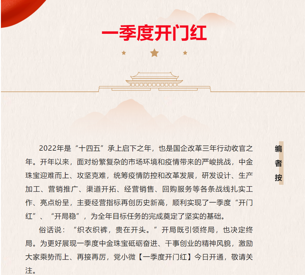 面对当前复杂多变的国内外经济形势以及疫情常态化下的黄金消费市场持续低迷等不利局面,中金珠宝在产品端如何“破题”?答案显而易见:坚持“文化+”赋能产品研发,赋能企业发展,一方面在做好传统渠道业务拓展的同时完善产业链,全面树立“黄金为民,送福万家”的央企形象;另一方面,在传递黄金价值的同时深度思考核心业务,做优做强产品,让文化产品“飞入寻常百姓家”,不断满足人民群众对美好生活的需要。相信在奠定了一季度开门红良好开局的基础上,中金珠宝产品设计研发团队将继续瞄准全年任务目标,在项目开发中坚定文化自信,在团队历练中凝聚奋进力量,以优异成绩迎接党的二十大胜利召开!