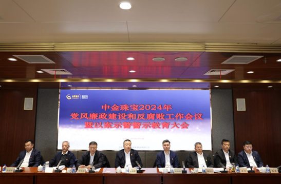 中金珠宝党委书记、董事长刘科军出席会议并讲话。党委副书记、总经理刘炜明传达二十届中央纪委三次全会、集团公司党委2024年党风廉政建设和反腐败工作会议精神。党委副书记贾玉斌主持会议。党委委员、纪委书记韩建辉作纪委工作报告并通报了典型案例。中金珠宝党委班子成员出席会议。