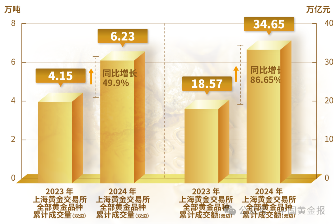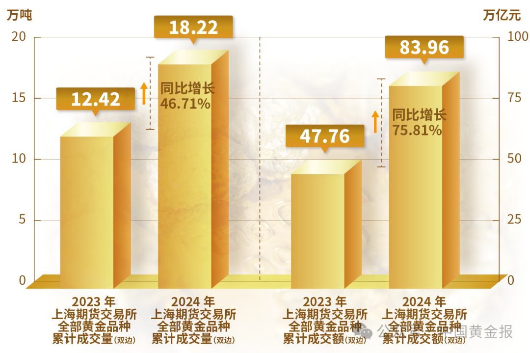 2024年,面对黄金价格波动,我国黄金市场呈现快速发展势头,黄金市场成交量、成交额大幅增长。上海黄金交易所全部黄金品种累计成交量双边6.23万吨(单边3.11万吨),同比增长49.9%,成交额双边34.65万亿元(单边17.33万亿元),同比增长86.65%;上海期货交易所全部黄金品种累计成交量双边18.22万吨(成交量单边9.11万吨),同比增长46.71%,成交额双边83.96万亿元(单边41.98万亿元),同比增长75.81%。与此同时,上海黄金交易所和上海期货交易所积极采取措施应对风险,完善交易制度,强化市场监管监测,保障了我国黄金市场的平稳健康运行。