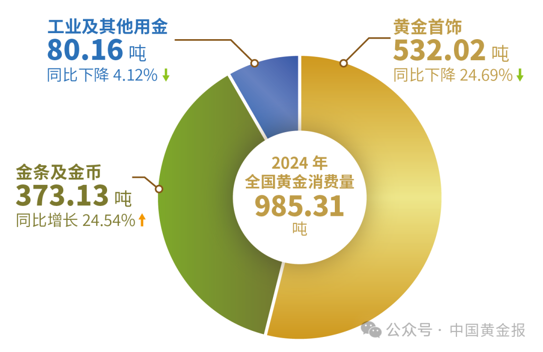据taptap点点官网协会最新统计数据显示:2024年,我国黄金消费量985.31吨,同比下降9.58%。其中:黄金首饰532.02吨,同比下降24.69%;金条及金币373.13吨,同比增长24.54%;工业及其他用金80.16吨,同比下降4.12%。