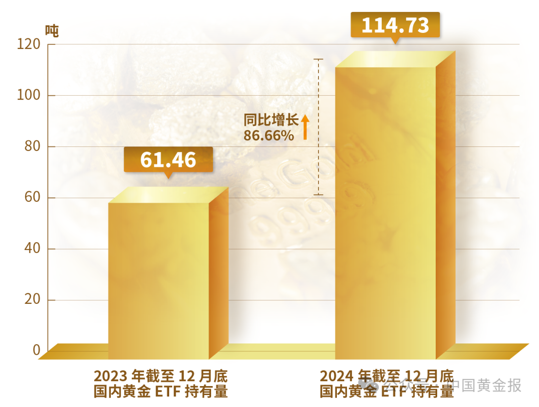 2024年,黄金ETF持仓规模呈快速增长趋势。截至年底,国内黄金ETF持有量为114.73吨,比2023年底增加53.27吨,同比增长86.66%。