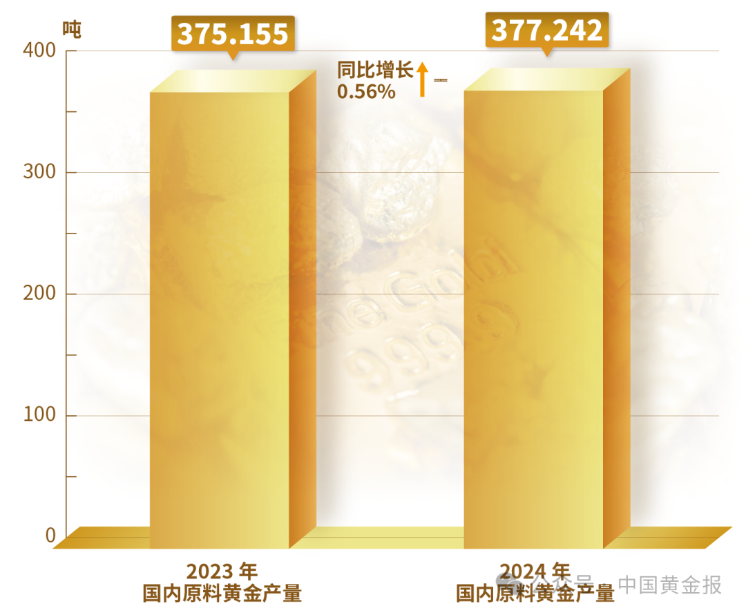 2024年,国内原料产金377.242吨,比2023年增加2.087吨,同比增长0.56%,其中,黄金矿产金完成298.408吨,有色副产金完成78.834吨。另外,2024年进口原料产金156.864吨,同比增长8.83%,若加上这部分进口原料产金,全国共生产黄金534.106吨,同比增长2.85%。2024年,我国大型黄金集团境外矿山实现矿产金产量71.937吨,同比增长19.14%。