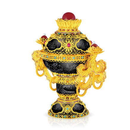 藏品以墨玉制成炉身,以金包银花丝覆盖其上,并以花丝堆垒成莲花瓣图案,炉身之上金包银花丝留空处形成朵朵祥云图案。祥云内以银丝编成蝙蝠寿桃图案表达“福寿之意”其中蝙蝠又怀抱铜钱,巧妙地运用谐音表达“福在眼前”的祝福。并镶嵌有佛教七宝之一的玛瑙等宝石,既可作为摆件祈福纳祥,又可作为高端贵金属艺术品进行投资、鉴赏与收藏。